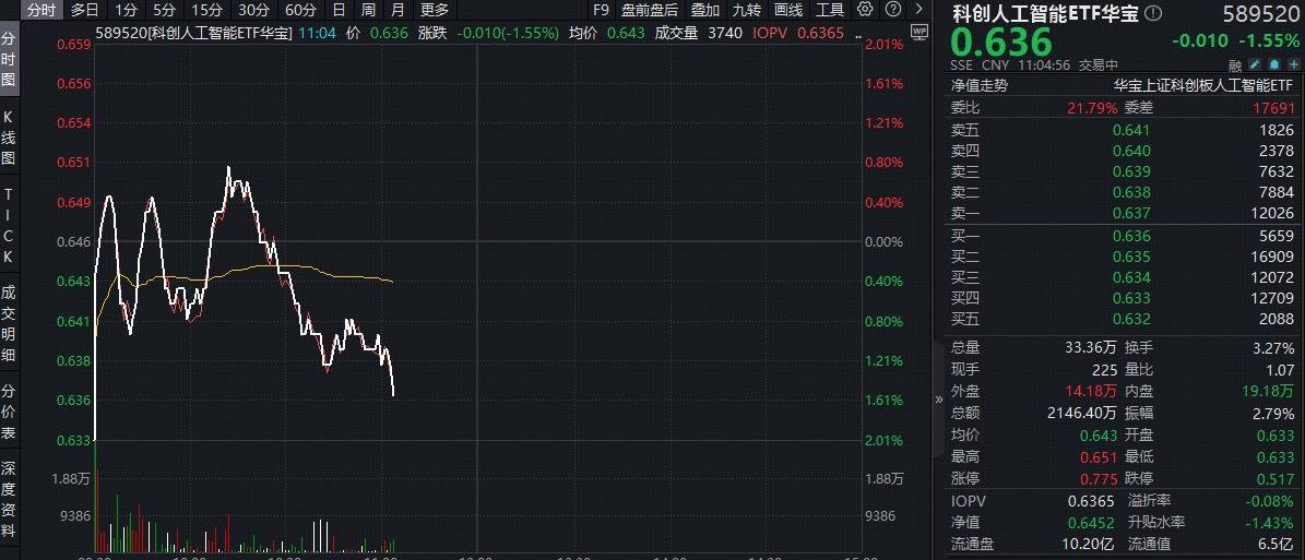 盘面上,或受地缘情绪扰动,重点布局国产AI产业链的科创人工智能ETF(589520)表现萎靡,当前在水面附近震荡,场内价格现跌1.55%,而资金看好国产算力后市表现,提前进场埋伏,昨天该ETF单日吸金2782万元。